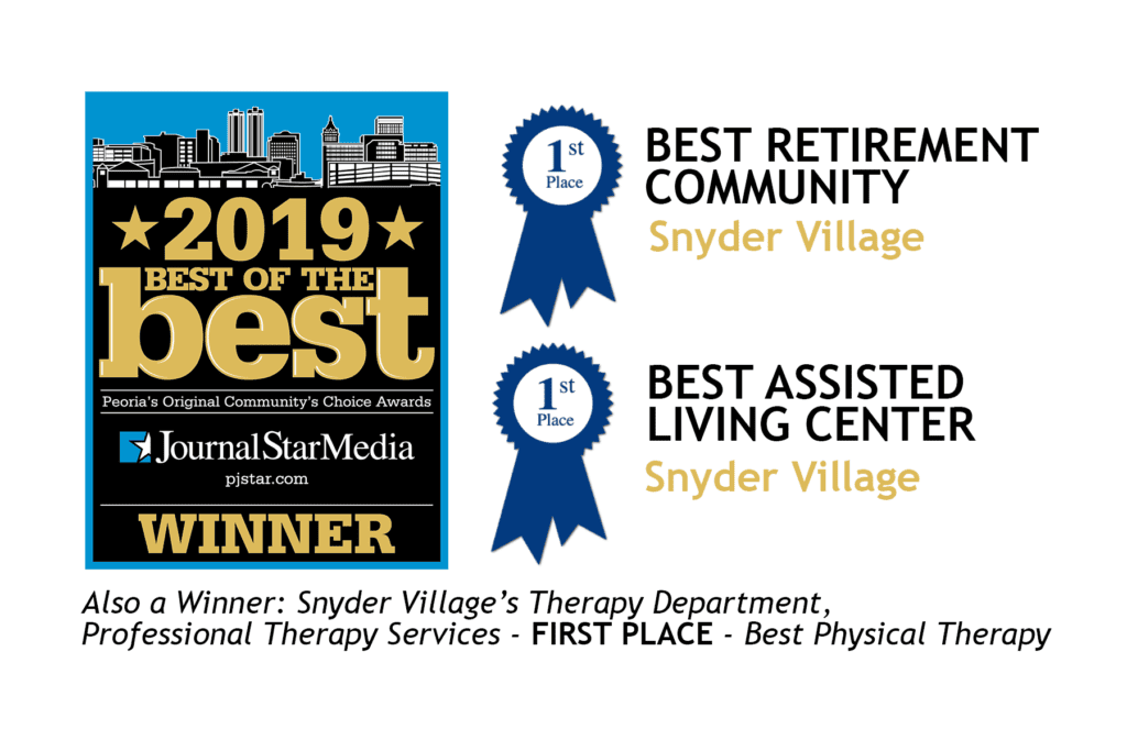 PEORIA, IL, October 10, 2019 – Snyder Village was honored to be recognized at this year’s Best of the Best Award Ceremony. The Best of the Best Awards are “Peoria’s Original Community’s Choice Awards” where the public gets the opportunity to vote for their favorite businesses and services in dozens of categories. Snyder Village was nominated in two categories, Best Retirement Community and Best Assisted Living Center, claiming first place in both categories. Snyder Village’s therapy department, Professional Therapy Services, was also nominated and was awarded first place for Best Physical Therapy. These awards are especially meaningful, as they are chosen by the friends and neighbors who make our community such a special place to call home.