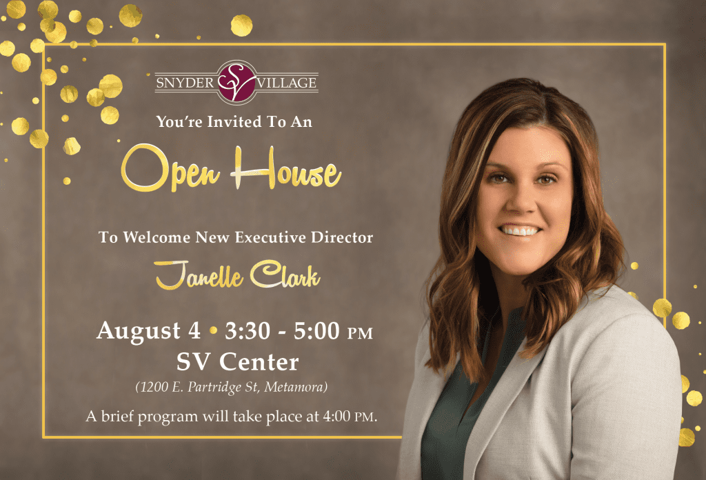 The Snyder Village Board of Directors will host an Open House for the public to welcome new Executive Director Janelle Clark. The event will take place on Thursday, August 4 from 3:30 p.m. – 5:00 p.m. at the SV Center (1200 E. Partridge St., Metamora, IL 61548) on the Snyder Village campus. A brief program featuring words from Board President Greg Minger and Janelle Clark will take place at 4:00 p.m. Light refreshments will be served.
