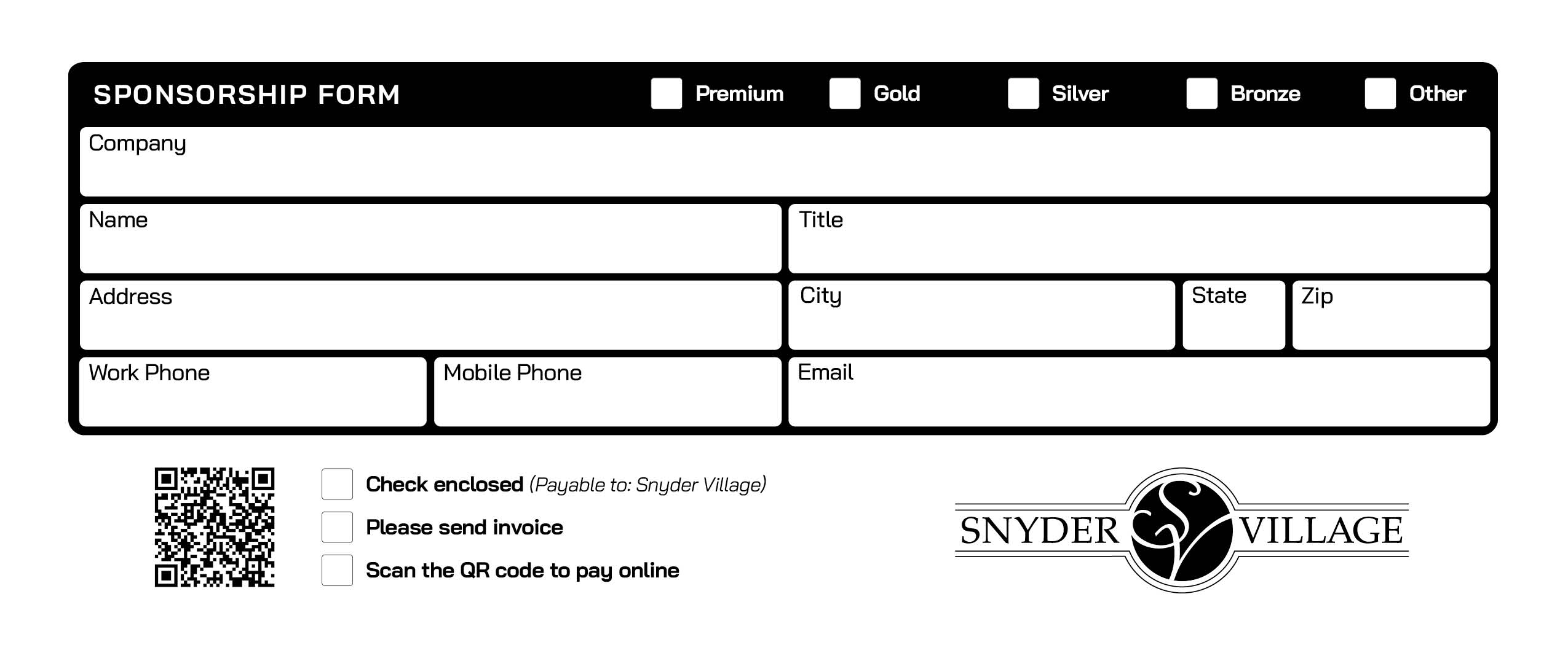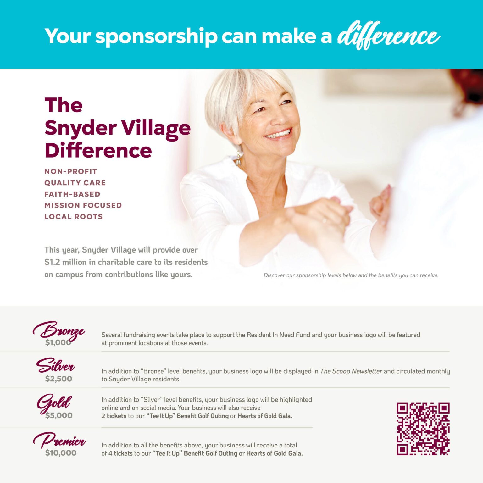 Snyder Village hosts fundraising events to support the Resident In Need Fund and your business logo will be featured at prominent locations at those events.