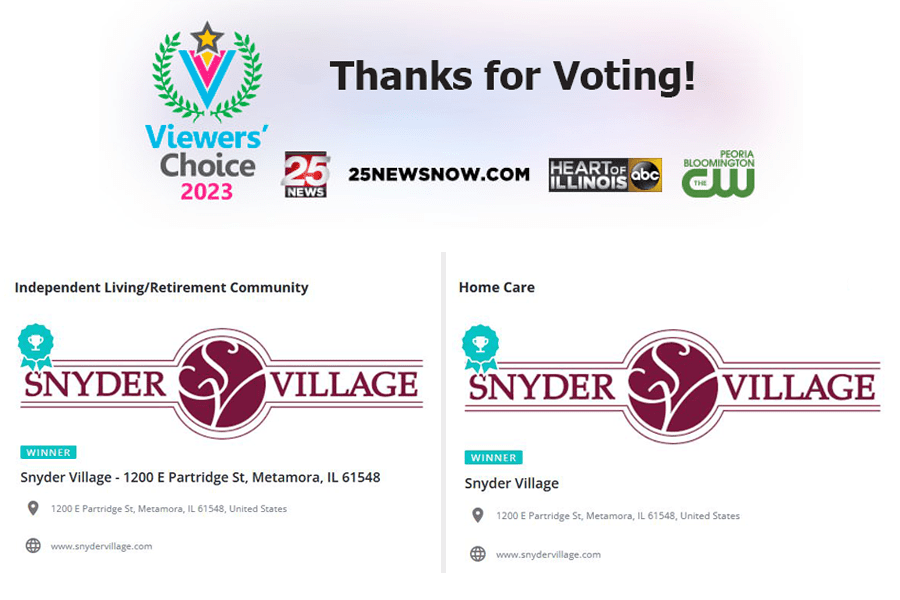 Snyder Village is pleased to be awarded the winner of the Viewer’s Choice Award for 2023. First place was awarded for both the Retirement Community and Snyder Village Home Care. The awards are voted on by local viewers of WEEK 25 and Heart of Illinois ABC.