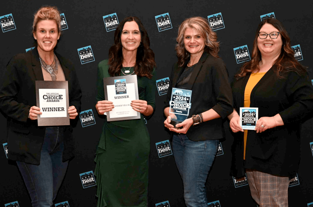 Snyder Village was honored to be recognized at the Peoria Journal Star’s 2024 Peoria Community’s Choice Awards. This awards program allows the public the opportunity to vote for their favorite businesses and services in more than 150 categories. Snyder Village was nominated in three categories, Best Nursing Home, Best Assisted/Senior Living, and Best 55+/Retirement Community, claiming winner in the category of Best 55+/Retirement Community. Representing Snyder Village at this year’s Gala was Janelle Clark, Executive Director; Julie Beltramea, Retirement Community Director; Heather O’Brien, Health Center Administrator; and Mallory Stutzman, Assisted Living Director. We thank the community for voting, and we remain committed to making Snyder Village your place to call home.